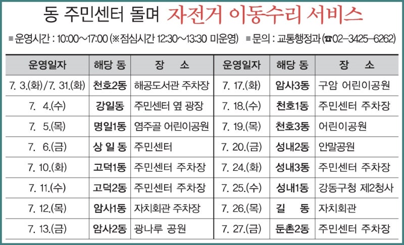 운영시간은 오전 10시부터 오후 5시까지다. 자전거 타는 법을 배우고 싶은 구민은 누구나 무료로 수강 가능하며, 강동바이스쿨로 문의하면 됩니다. 2019년 11월 자전거 이동수리 서비스 일정(안) 2019년 자전거 이동수리 서비스 운영개요 운영기간 :